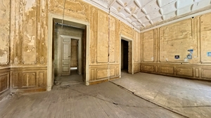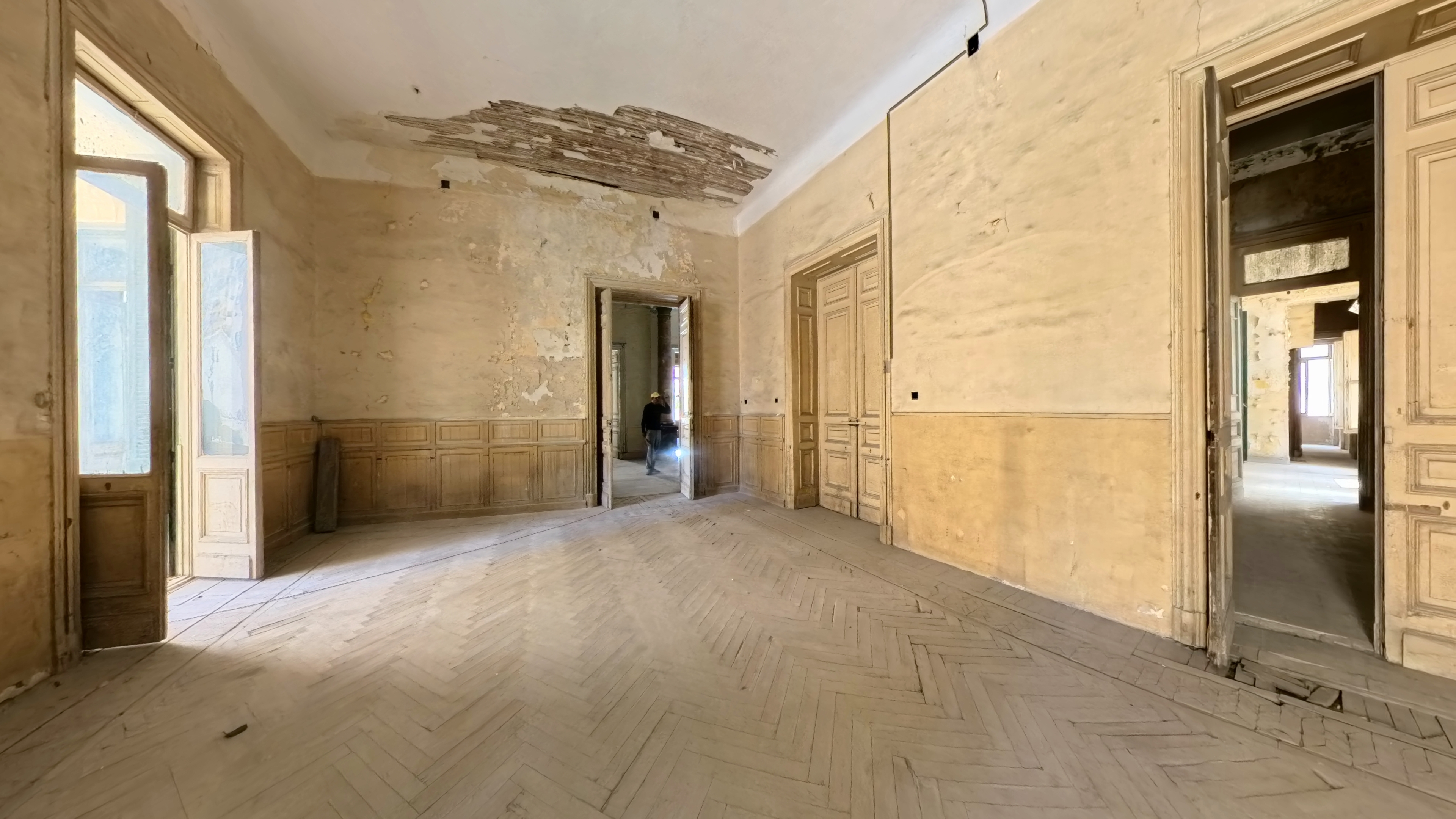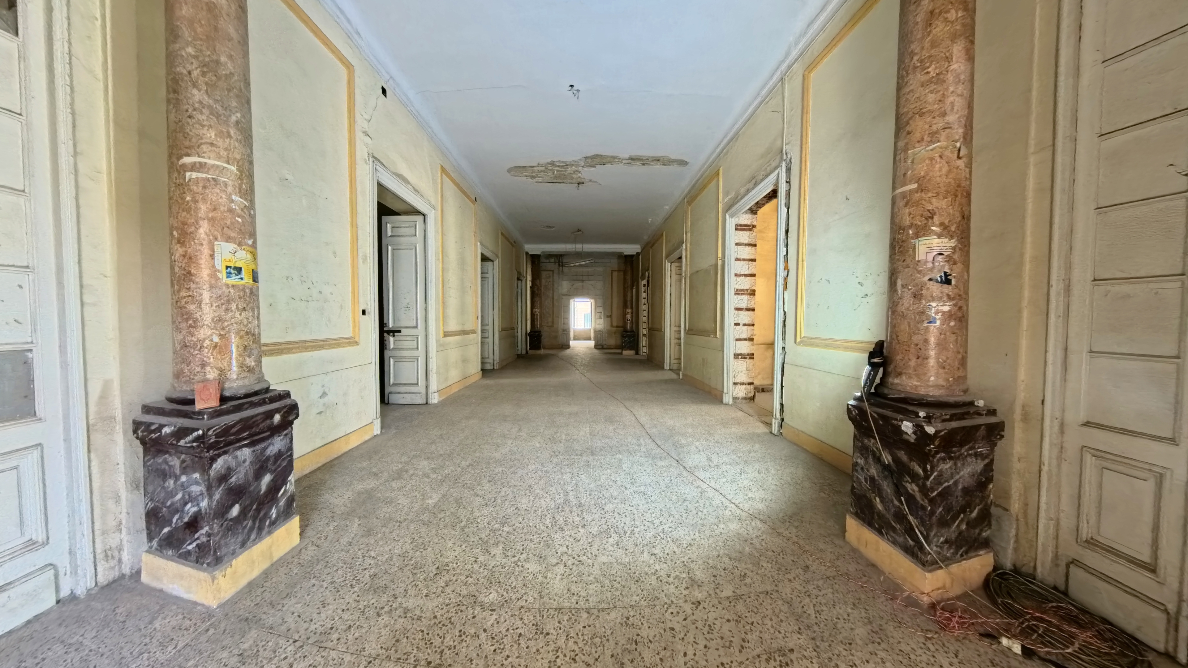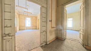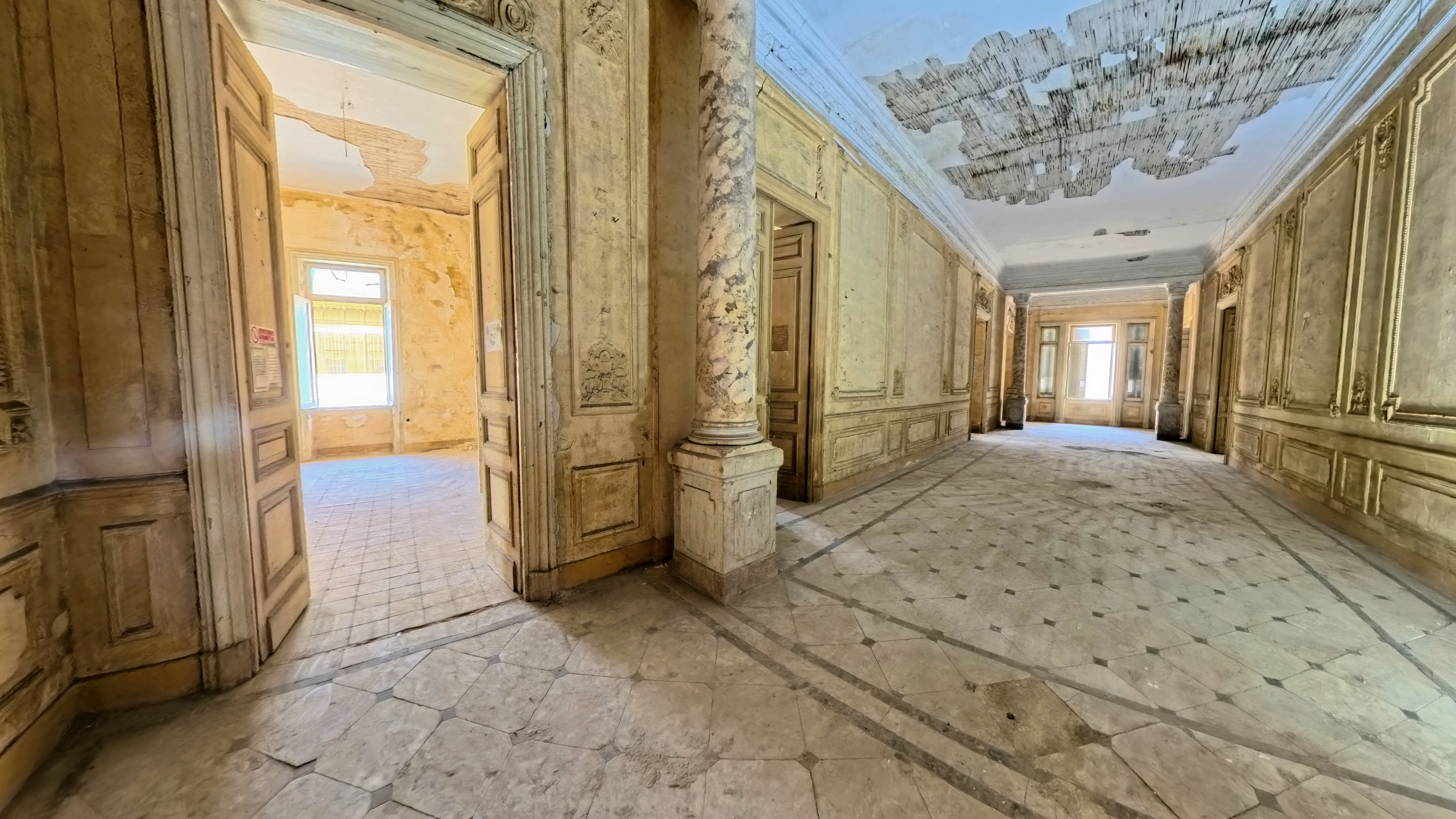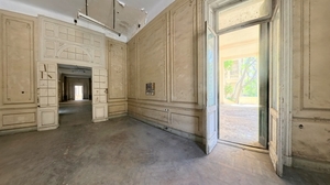 A grand wrought-iron portico entrance leads into interconnected reception salons and dining halls, each with over 6 m ceilings, original marble or parquet floors and direct access to an internal courtyard garden.