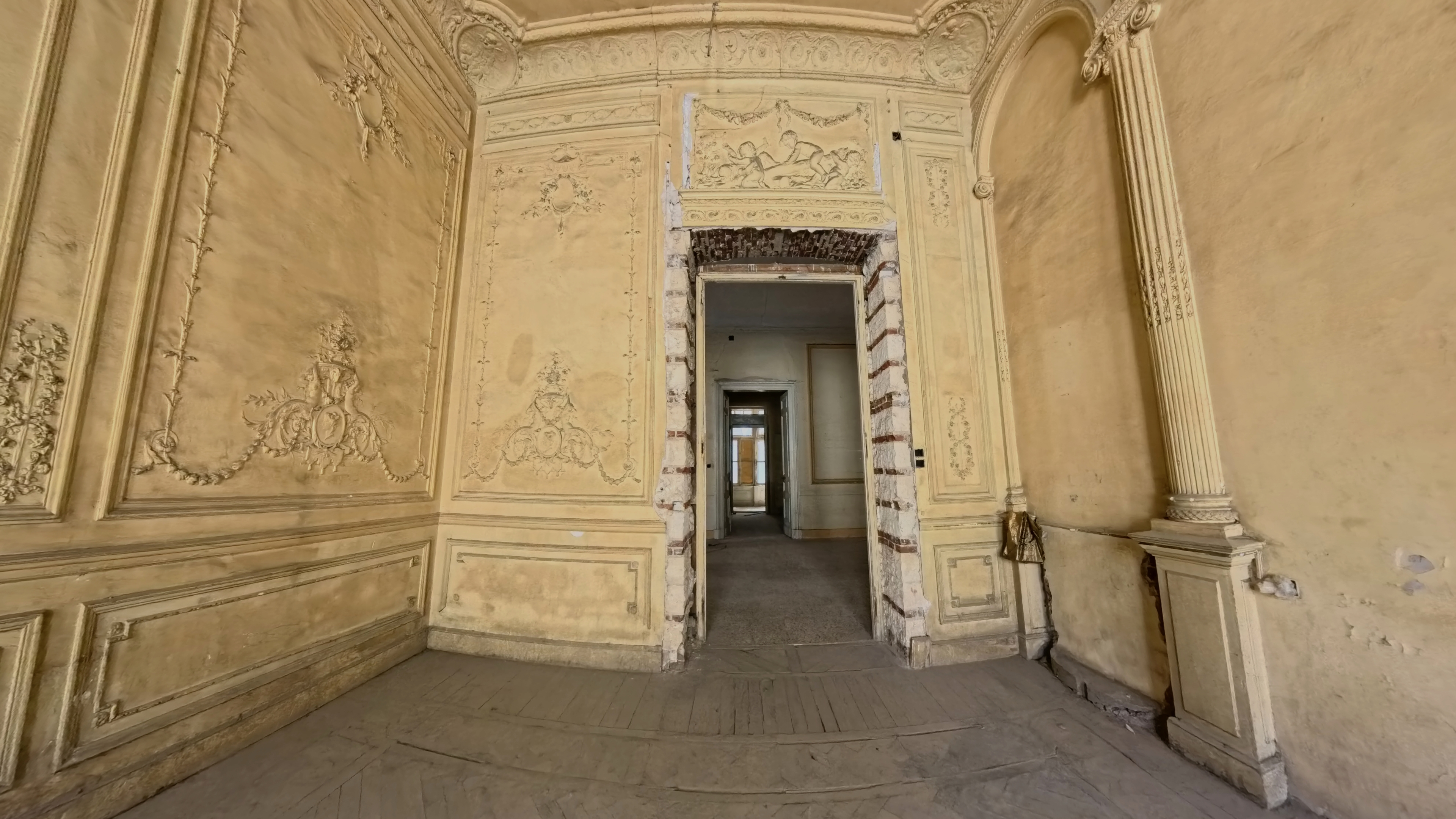 Period marble-inlaid and herringbone-parquet floors